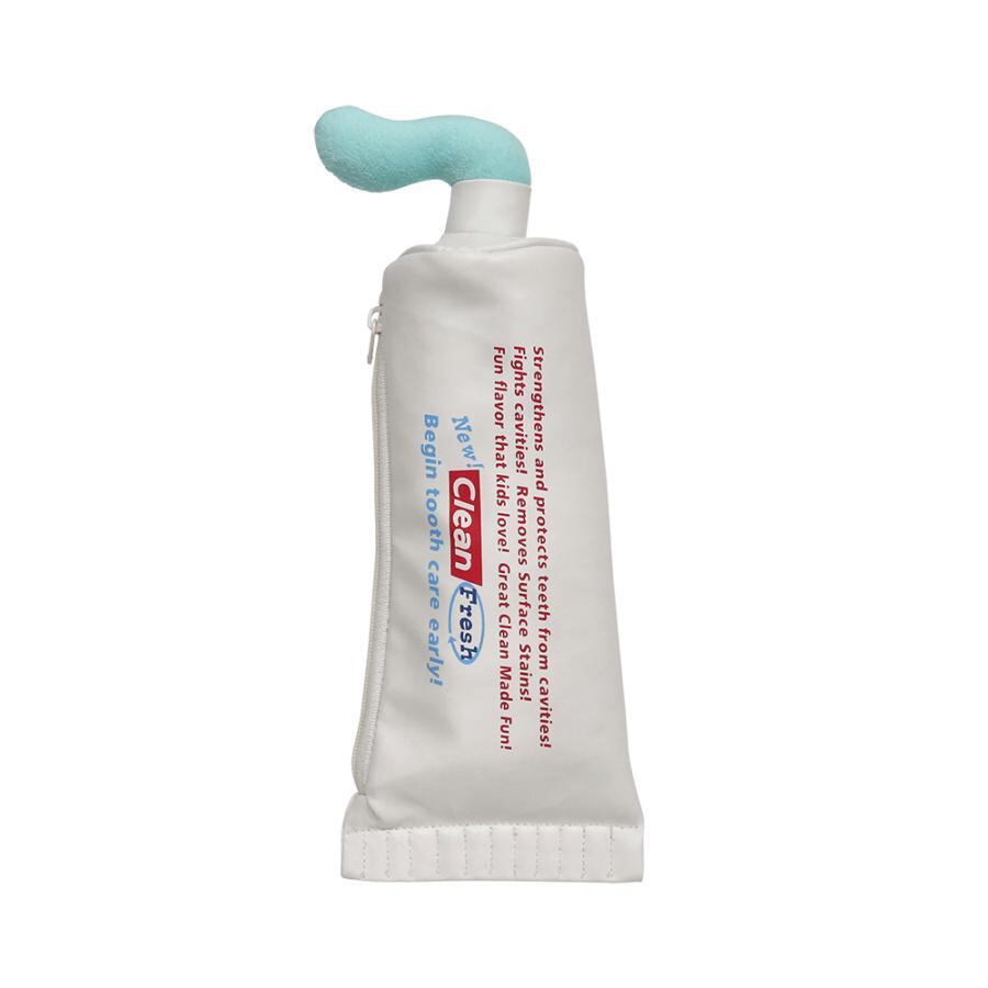 ユニークな歯磨き粉型ペンシルケース。プラスチック目玉。ジッパー。裏地。